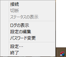 また右クリックしても[設定]と[終了]しか見当たりません。この設定はプロキシの設定なので普通はしなくても大丈夫です。