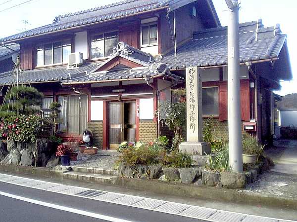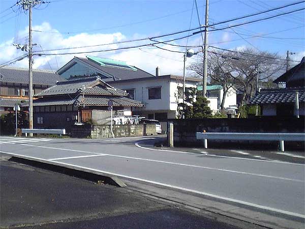 「明治天皇馬場御小休所」の碑が建っている、街道左側の民家が「