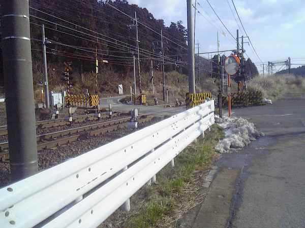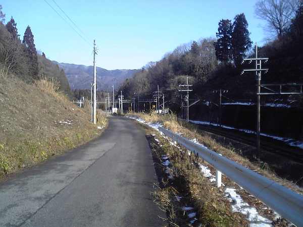 写真の左斜面の上を線路が走っている。だんだん挟まれて、行き止まりの踏切を右へ渡る。