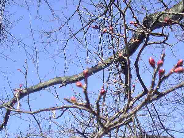不破関跡のすぐ傍を流れる関の藤川「藤古川(ふじこがわ)」。その畔に今にも咲きそうな桜?。暖冬異変・・・・・