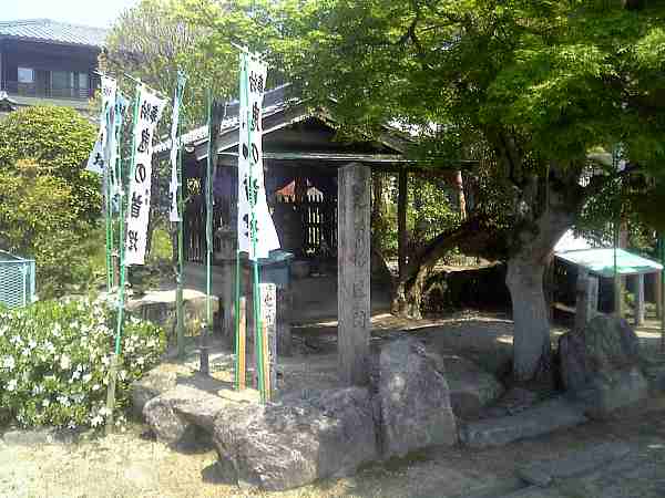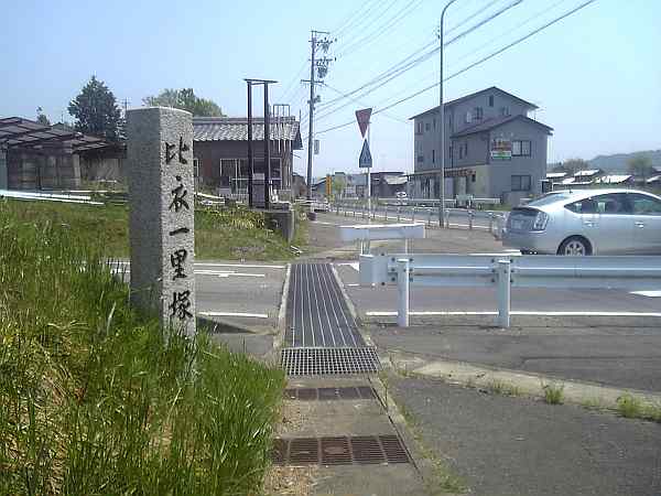 国道をしばらく行くと、左側に木陰の涼しげなほこらがある。「鬼の首塚」という。(左・左写真)