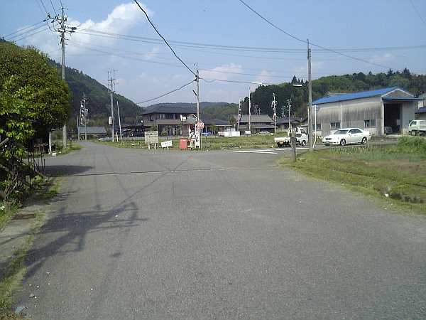 軽い上り坂を上り詰めた辺りに単車屋さん(レッドバロン)があり、踏切を越える(左・右写真)。