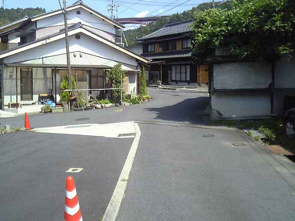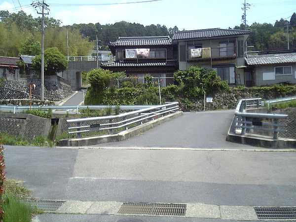 前方の山が近づいてくると、川の畔へ出る。橋の向こうは突き当たりであるが、