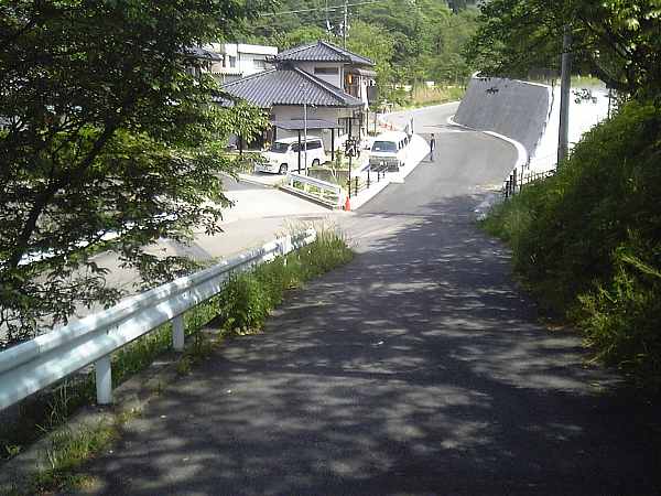 右の脇道ではなく写真奥の方へ下る。ちょっと分かりづらいが脇道の辺りからアスファルトの色が