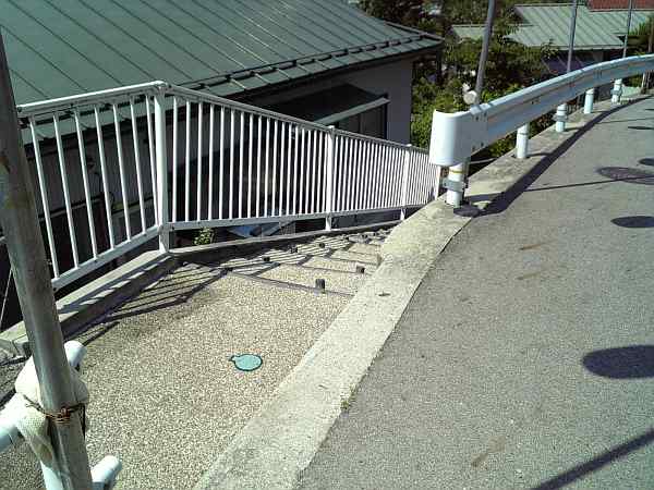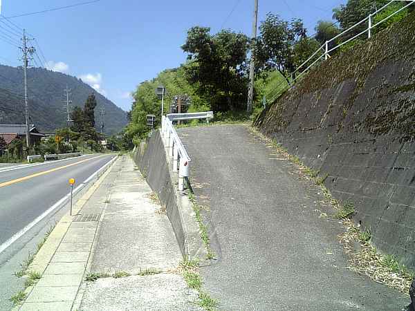 車道の左折迂回路のちょっと向こうに歩行者用の下り坂がある(左・右写真)。ここからしばらく国道とはお別れである。
