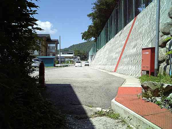 上松中学校の石垣伝いに進んでいくと、少し下って別の道路と合流する(左・右写真)。