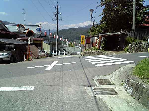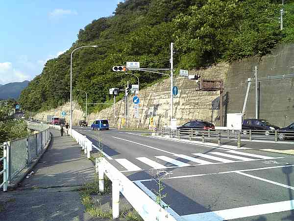 トンネルを出てきた19号線バイパスと旧19号線の交差点(下・左写真)。残念ながら横断歩道がない。