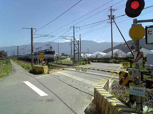 畑の続く中をほぼまっすぐに進んでいくと中央本線の踏切に来る(右・右写真)。