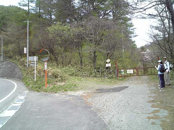 国道が大きく左カーブするところを、柵のある林道の左側へ登る(左・右写真)。