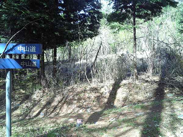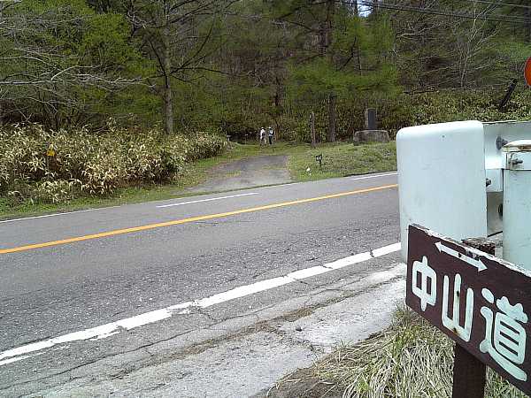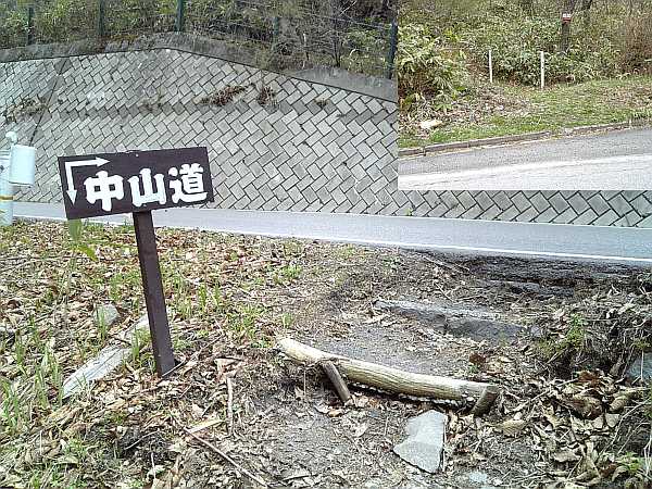 眼下に町並みが見える頃、舗装された脇道が右手へ下っている(右・左写真)。これが中山道である。