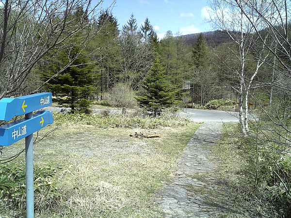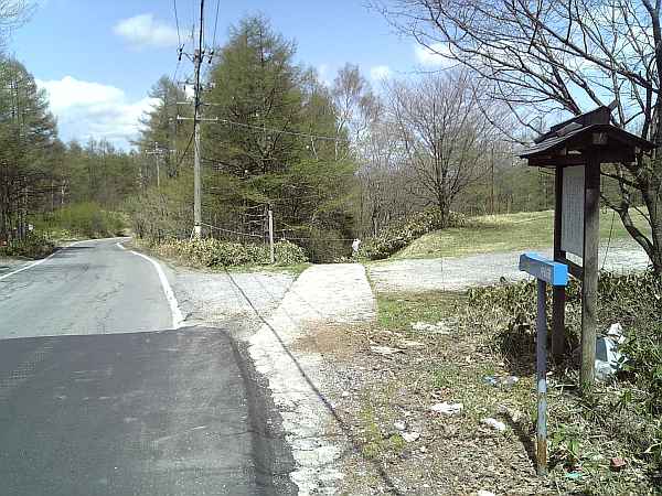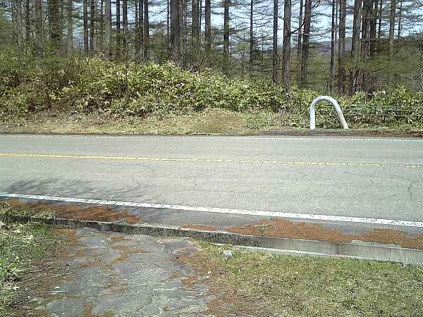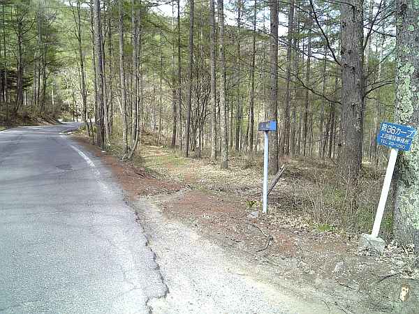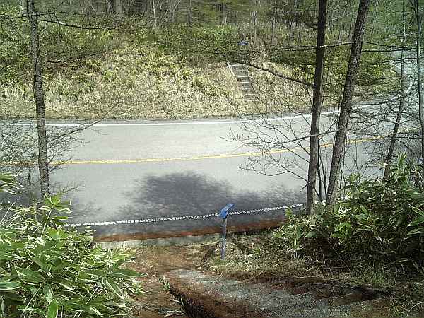 峠から初めての交差点(右・右写真)。車道(ビーナスライン)の向こう側にある小さな階段を上がる。