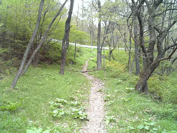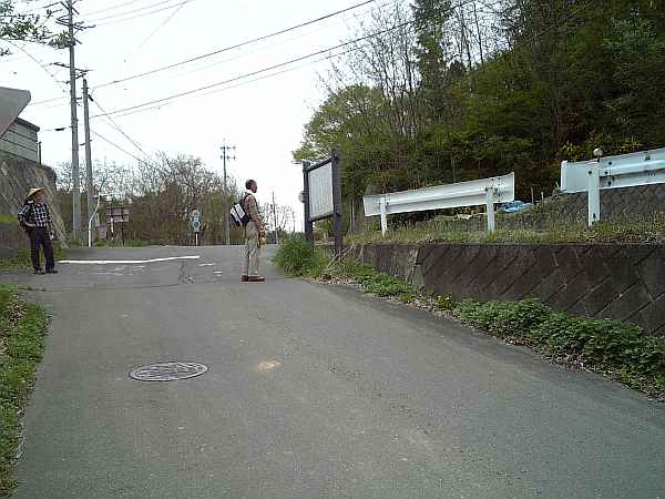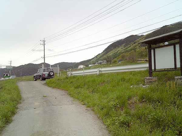 すぐに、ガードレールの切れ目に上りつく(左・右写真)。旧国道を左へとりしばらくアスファルト道を行く。