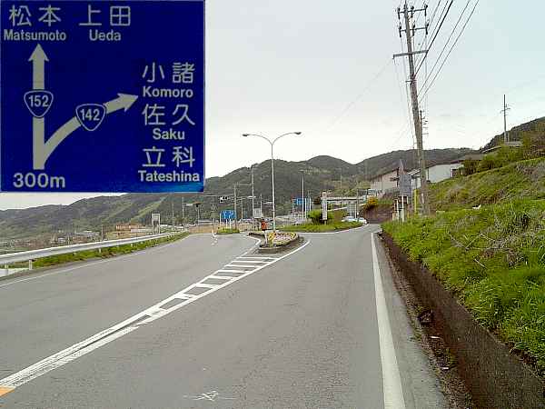 しばらく行くと松本方面の152号線と佐久方面の142号線に分かれる(左・左写真=標識ははめ込み)。