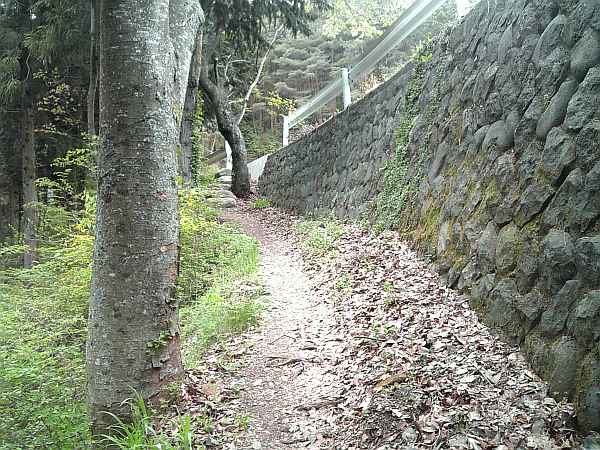 左に本殿を見て、前方にある小さな祠の右を抜け、旧国道の石垣に沿って上る(右・左写真)。