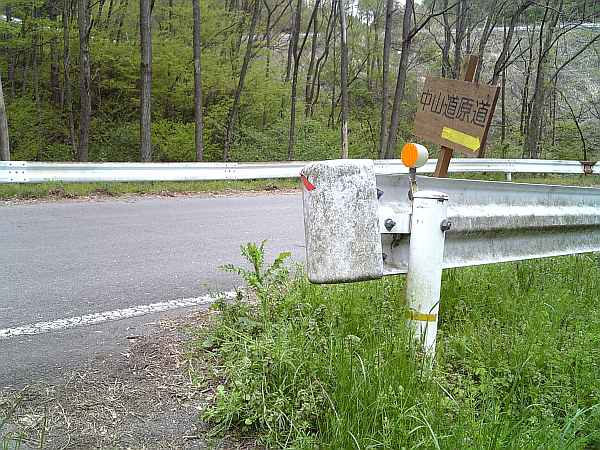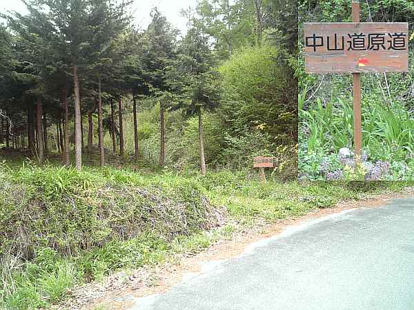 上の車道を写真奥へ進むのであるが、ちょっと先に先ほどの草だらけの道が中山道との表示があった(右・左写真)。
