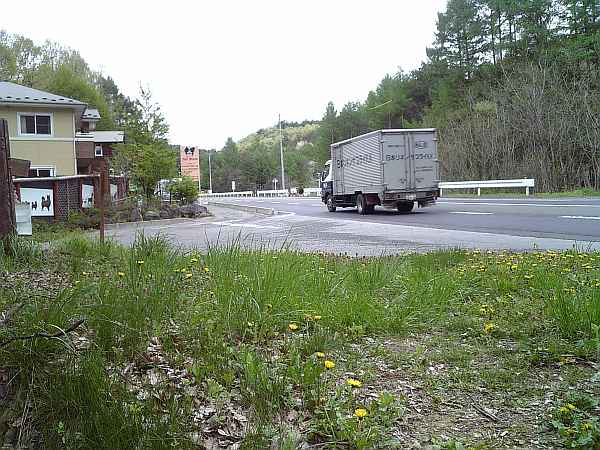 その国道との交差点(右・左写真)。横断歩道は有るが信号はない。車がかなりのスピードで下ってくる。