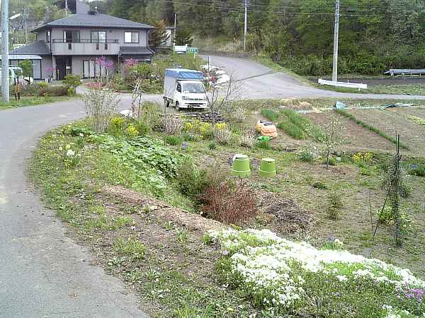 もう少しで車道へ出るというところで、コンクリートを敷いた左と、草だらけの右とに分かれている。