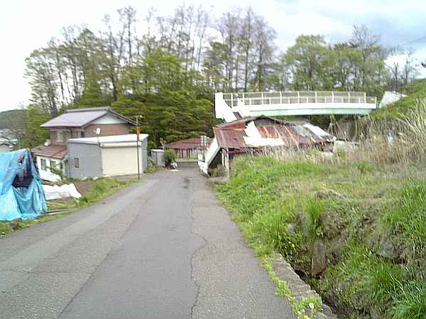 人心地ついて出発。坂を下って鹿曲川を渡ると、斜めに集落の一角に入り(右・右写真)、