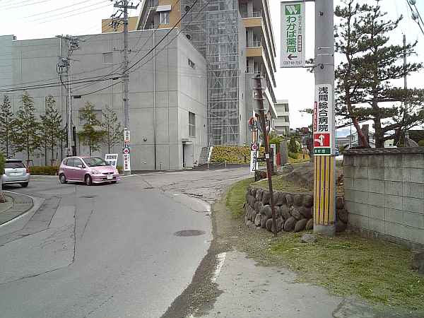 道なりに左へ曲がり「浅間総合病院」の前を通って進んでいくとJR小梅線の踏切を渡る(左・左写真)。