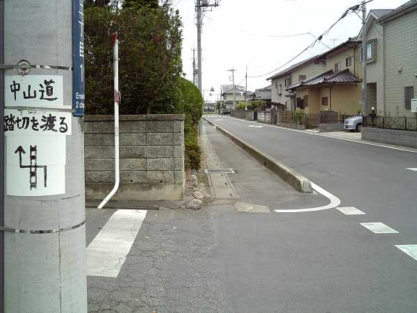 しばらく集落内を進むとだんだん新しい住宅街となる。その一角の電柱に「中山道踏切を渡る」の張り紙(左・左写真=9:09)。