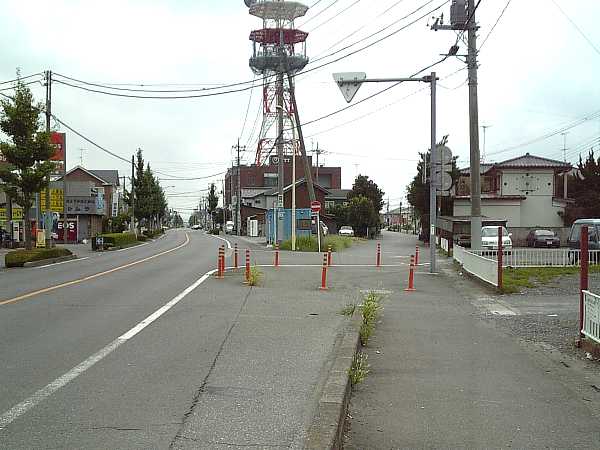 駅前を過ぎしばらくすると、大きなアンテナ塔のあるNTTの局舎を挟んで二股になっている(左・右写真=9:33)。