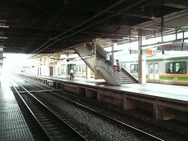 鴻巣駅プラットホーム、大宮、東京方面。新幹線も喫煙席なら空いているとのことで座って帰れそうだ。