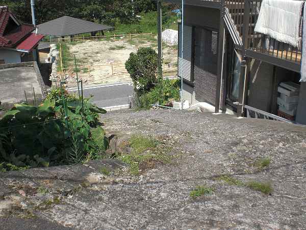 道なりにしばらく行くと、急坂(階段?)が下の道へ続いている。(右・右写真=11:03)