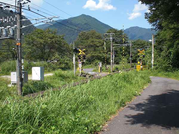 小さな踏切を二回渡り(右・左写真=12:47)、大きな踏切に出る。ここは線路沿いに上っていくフェンスのある歩道を行く。(右・右写真=13:00)