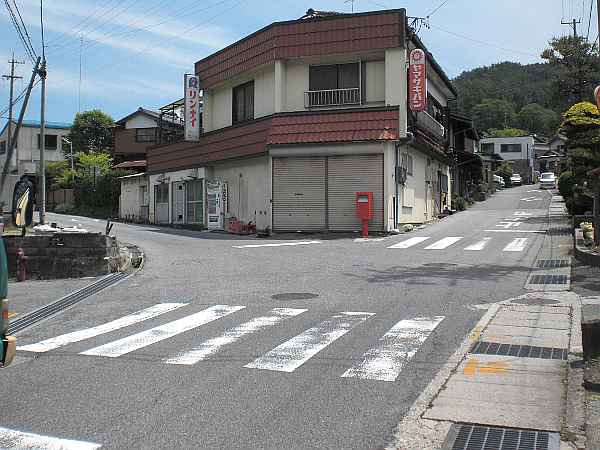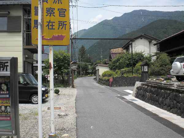 駐在所の黄色い看板の向こうに常夜灯のある丁字路がある(左・右写真=12:35)。右に折れて先ほどの真っ直ぐ行けば・・・の道に戻る。