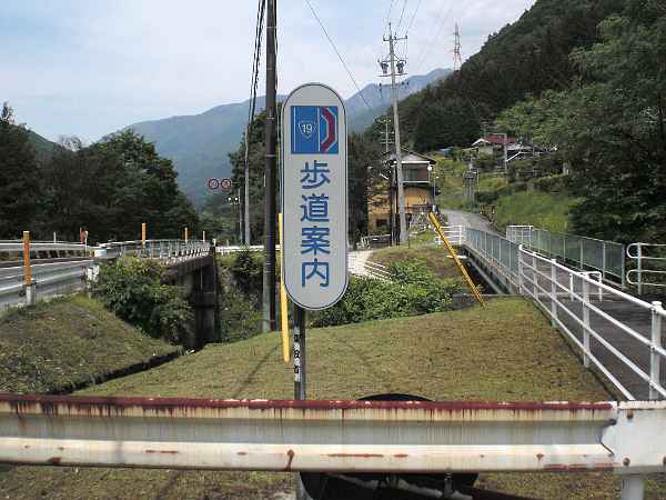 「万場信号」を過ぎてしばらくすると中山道色(オレンジのような茶色)に塗られた歩道橋がある(左・左写真=13:49)。