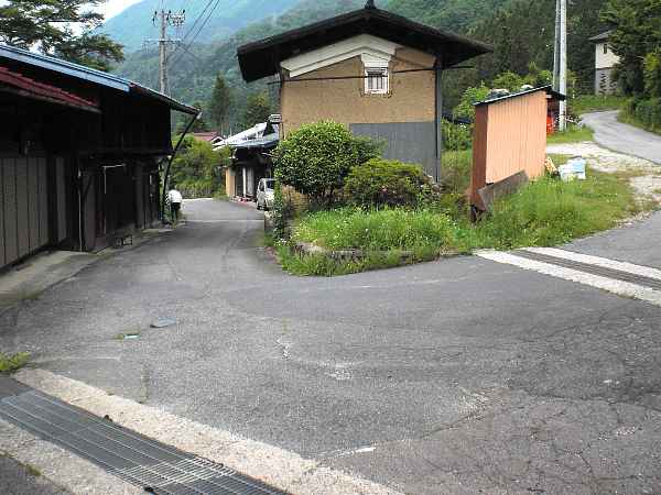 上り詰めると集落内のアスファルト道に出る。ここを左に取り集落内を進む(右・左写真=13:54)。