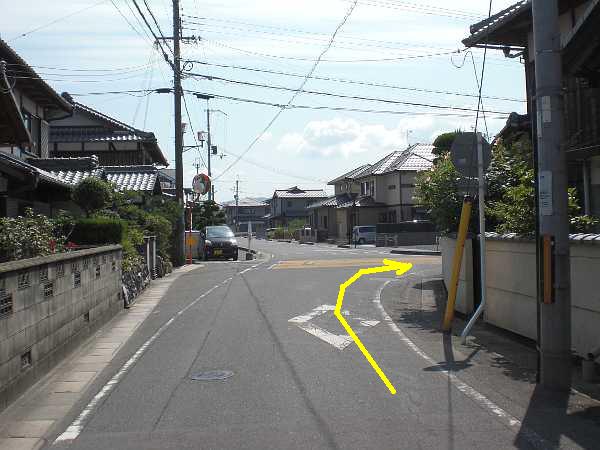 一旦停止の交差点を一つ越えて、次の直進する道路が細くなっている三叉路を