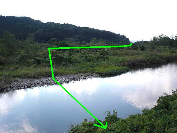 横田の渡し」である(左・右写真=13:57)。右手の山の端が先ほどの三雲方面である。