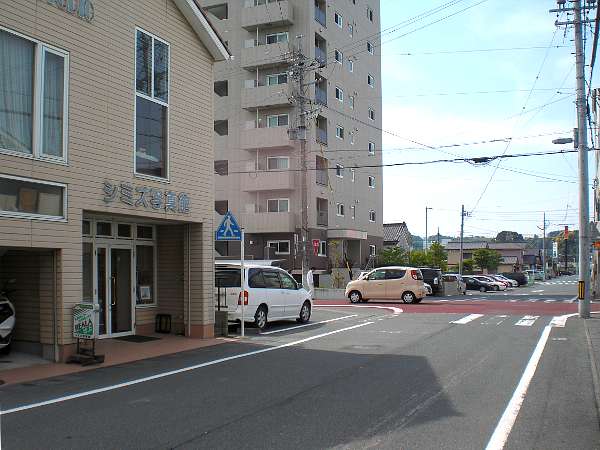 さらに,二筋目(交差点内茶色の舗装)「シミズ写真館」の角を