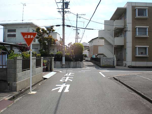 [とまれ]標識のある十字路,「URBAN LIFE」と言うマンションの前を