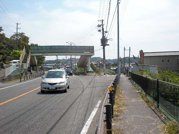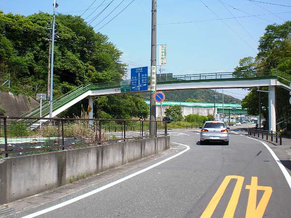 国道一号線を2km近く歩くと,右手川向こうに栄川中学校が見え,前方に歩道橋のある分岐(Y字路)が見えてくる(左・左写真=10:19)。