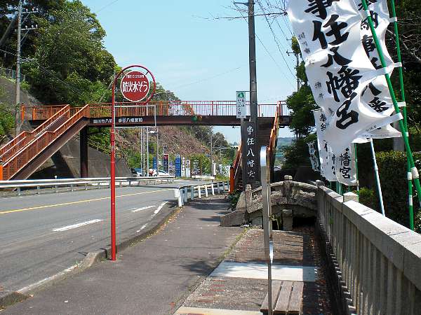 しばらく側道を歩いて行くと神社が右手に見えてくる。「事任