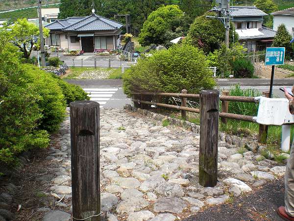遙かに見下ろしていた国道一号線を見上げるほどに下りた辺り,アスファルト道の丁字路のすぐ手前に石畳の旧道がある(右・左写真=12:53)。