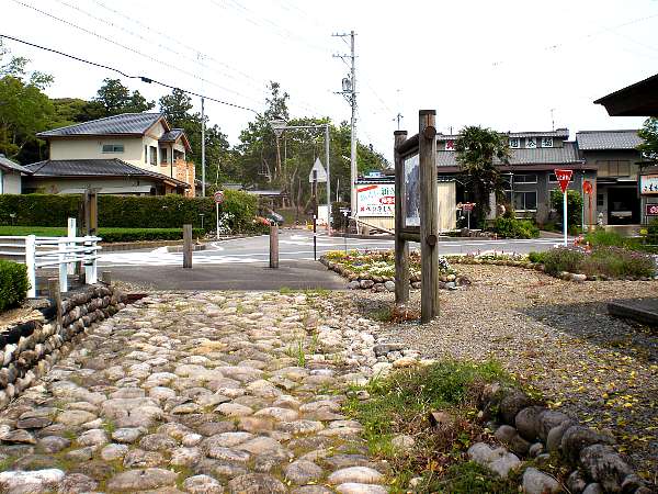 歩道を渡ると,さらに石畳が有り脇道に至る(右・右写真=12:54)。ここを右折して「間の宿 菊川の里」へ入る。
