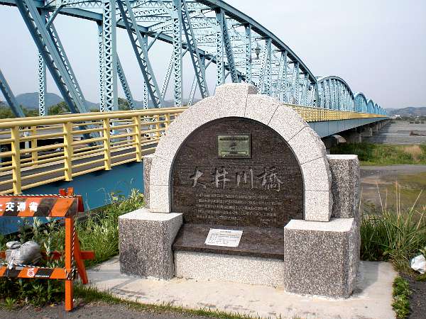 左手へ少し行った昭和3年架設の「大井川橋」(鋼製トラフ構造 1026.4m)を渡る(左・左写真=14:51)。