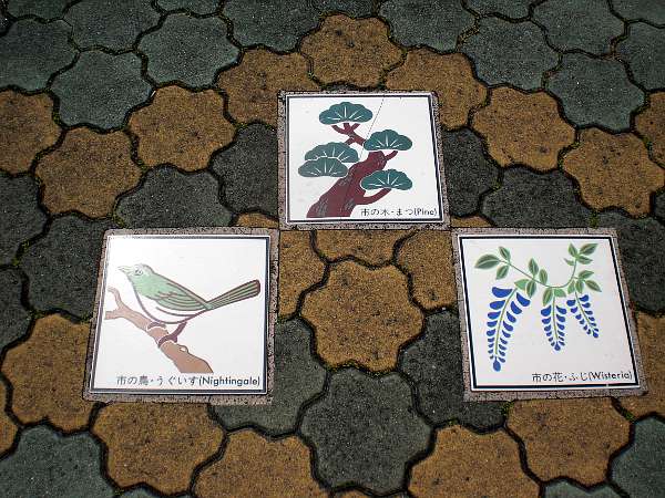 歩道のあちこちに市の「花・鳥・木」をデザインしたタイルが使われている(左・左写真=9:36)。