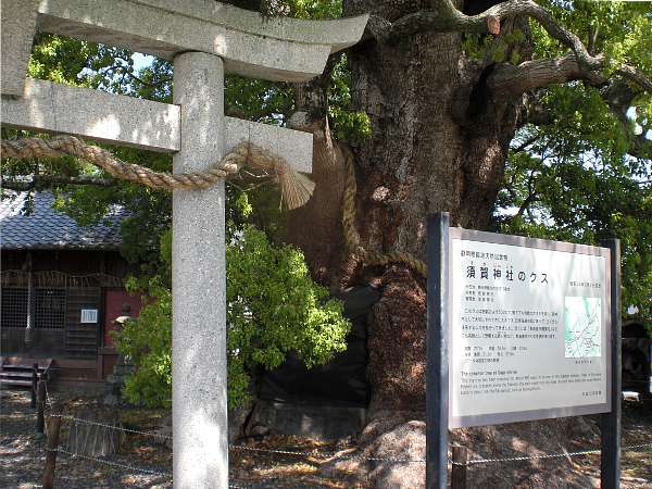 須賀神社の楠木」が目を引く。休憩するにはちょうど良い日陰を提供してくれる(左・右写真=9:59)。