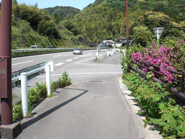 橋を渡って集落を出ると大正のトンネルから来た旧国道一号線に合流する(右・左写真=13:14)。