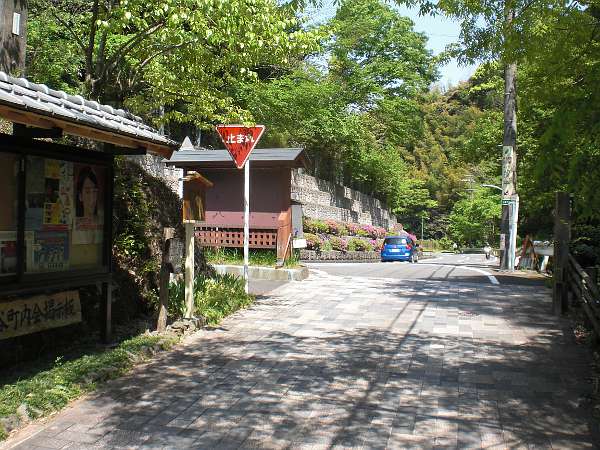 橋を渡ってすぐの「一旦停止」を右折して再び県道に合流する。ここが東入り口の枡形であったのだろう(左・右写真=11:50)。
