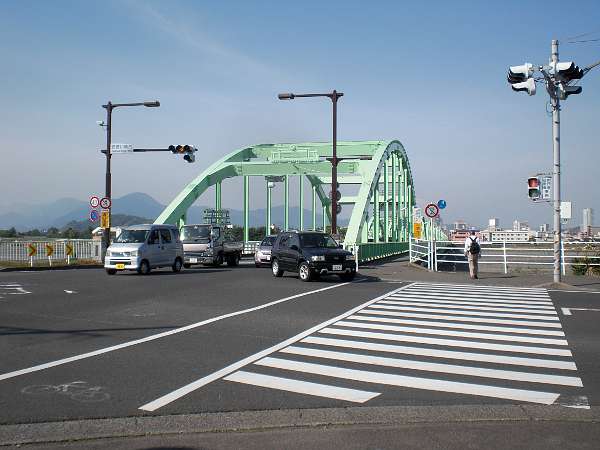 橋向こうが丁字路になっており,その突き当たりにある茅葺きの建物がうどんで有名な「