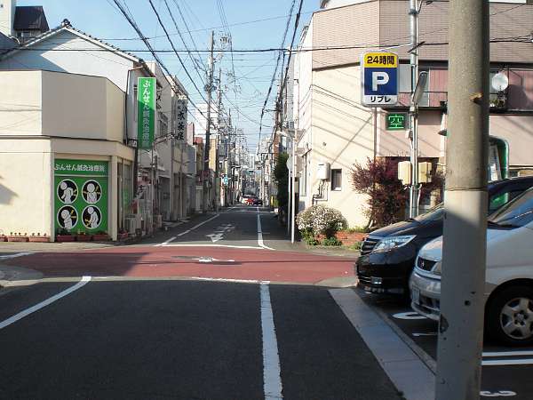 次の細い交差点が「駿河町通り」で,そこから二筋目(ぶんせん鍼灸治療院の草色の看板有り)を右折する(右・左写真=16:14)。
