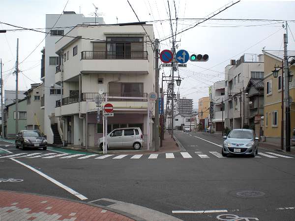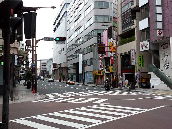 歩道を斜めに渡って江川町通りの右歩道を進む。昨日来た道からは交差点を左折することになる。(左・左写真=7:53)