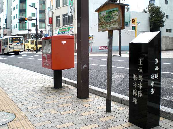 上伝馬本陣跡」の石碑が建っている(右・左写真 =8:09/596歩)。