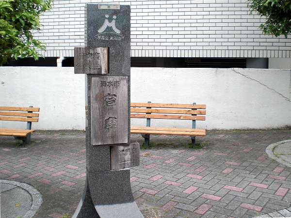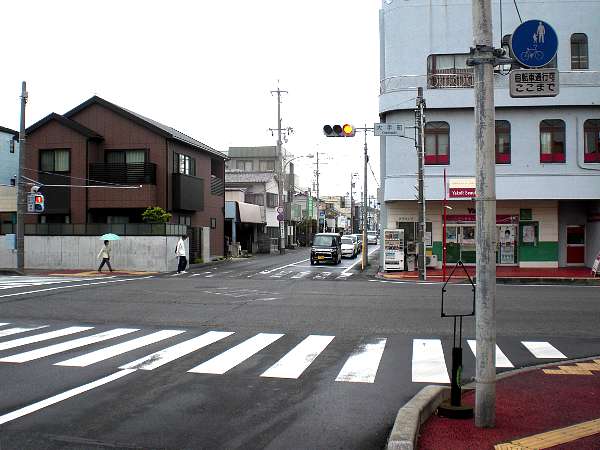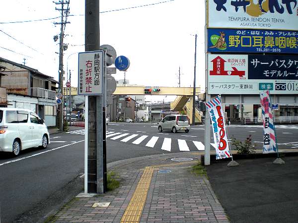 直進して清水駅前通の交差点[大手町](下・左写真)まで行ってしまったのだが,実はこの変則五叉路を右折するのが旧東海道であった。