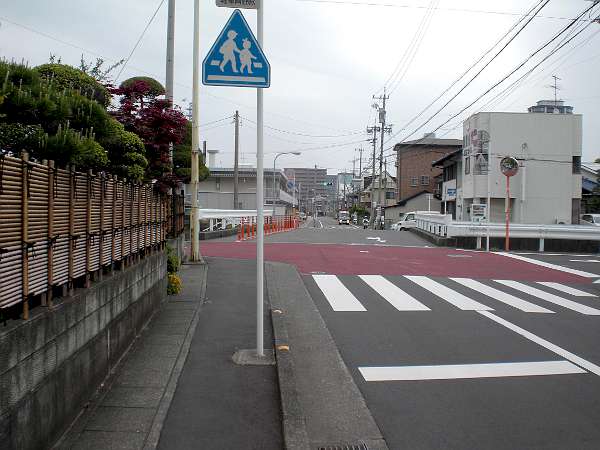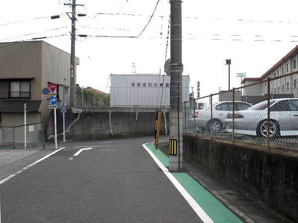 緩やかな坂を登っていくと静鉄 県総合運動場駅の付近で丁字路となる。ここを右折する(左・右写真=9:35)。